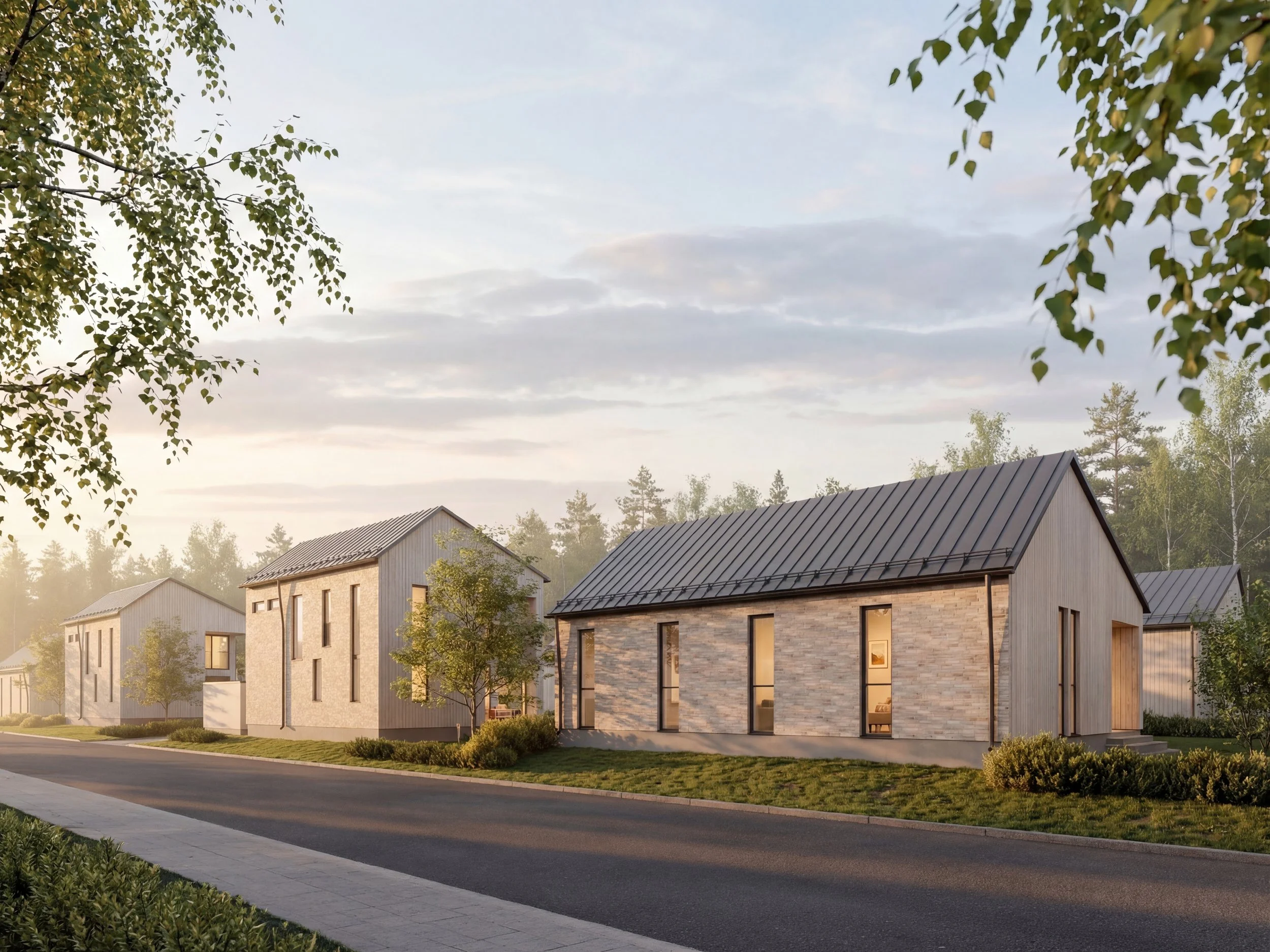 Lykke on kaunis, kahden paritalon ja yhden erillistalon kokonaisuus, joka valmistuu kesällä 2026 rauhalliselle alueelle Espoon Lansaan